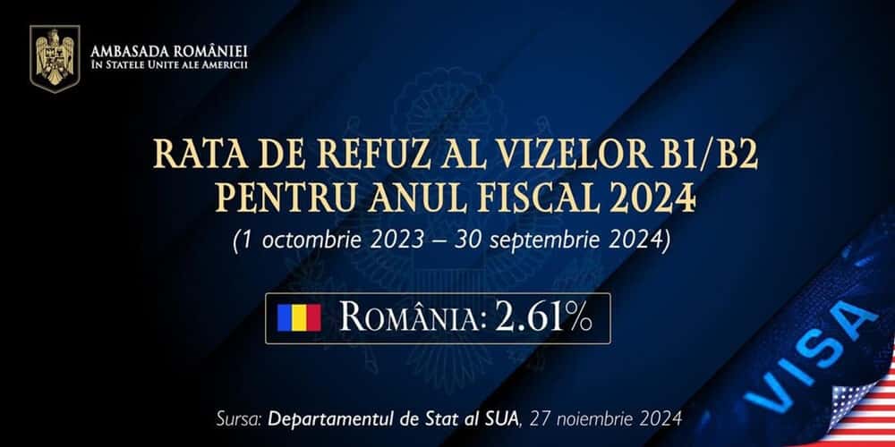 Departamentul de Stat a dat publicității, la 27 noiembrie 2024, situația ratei de refuz al vizelor B1/B2 pentru anul fiscal 2024 (1 octombrie 2023 - 30 septembrie 2024). România a scăzut sub pragul de 3% impus de legislația americană, îndeplinind astfel unul dintre criteriile principale de accedere în program. Rata de refuz a fost de 2,61%, potrivit cifrelor publicate miercuri de autoritățile din SUA.