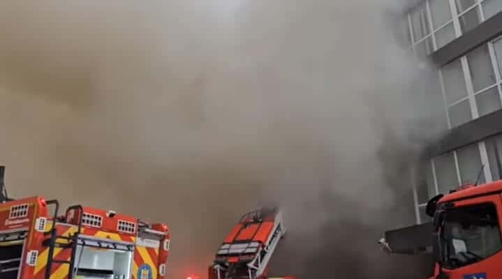 Pompierii continuă intervenția pentru stingerea incendiului. Clădirea găzduiește birouri și camere pentru muncitori.