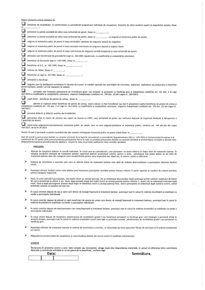 „Cererile pentru bilete de tratament pentru anul 2026 pot fi transmise pe adresa de email office@pensiiprahova.ro sau pot fi depuse la sediul din Ploiesti, strada Nicolae Iorga nr. 1, ghiseele 9 sau 10, de luni pana vineri, intre orele 8.30-12.30” anunță reprezentanții instituției.