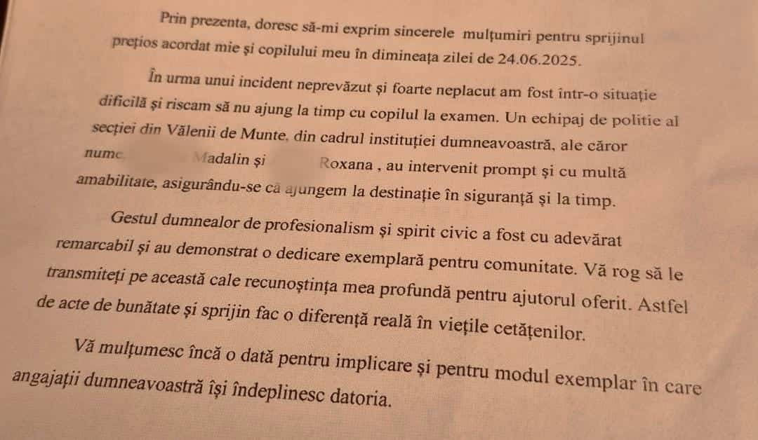 Inspectoratul de Poliție Județean Prahova îi felicită pe cei doi polițiști pentru profesionalismul de care au dat dovadă și le mulțumește pentru că au ales să fie parte din viitorul acestui copil, care – cu ajutorul lor – a reușit să ajungă la examen și să fie admis.
