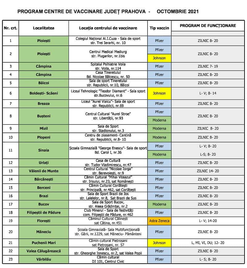 Prefectura Prahova a anunțat noul program al centrelor de vaccinare din județ, valabil în luna octombrie.