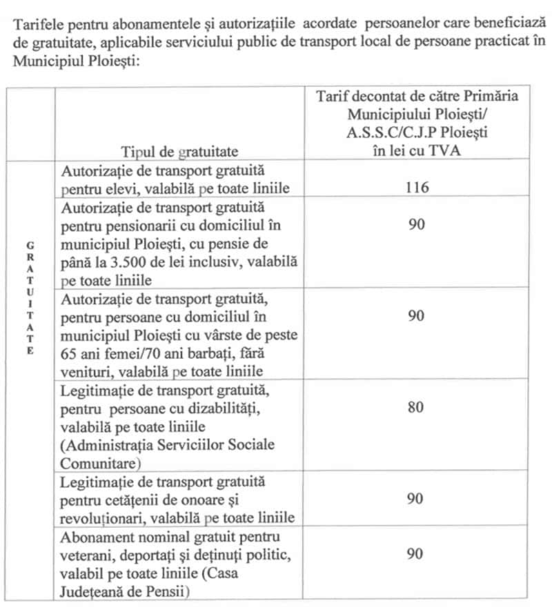 Proiectul include și actualizarea tarifelor la care sunt decontate, către TCE, abonamentele pentru categoriile de călători care beneficiază de gratuitate, conform legii și regulamentelor locale.