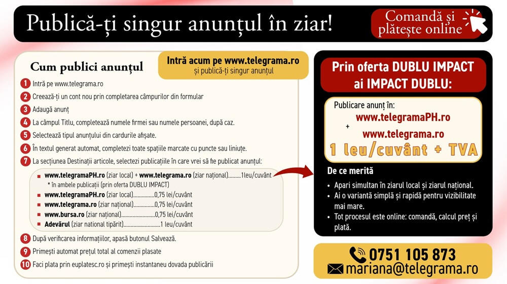 - Pachet mixt (Ziar Local + Național): Publicare pe www.telegramaPH.ro și www.telegrama.ro la prețul de 1 leu/cuvânt + TVA.