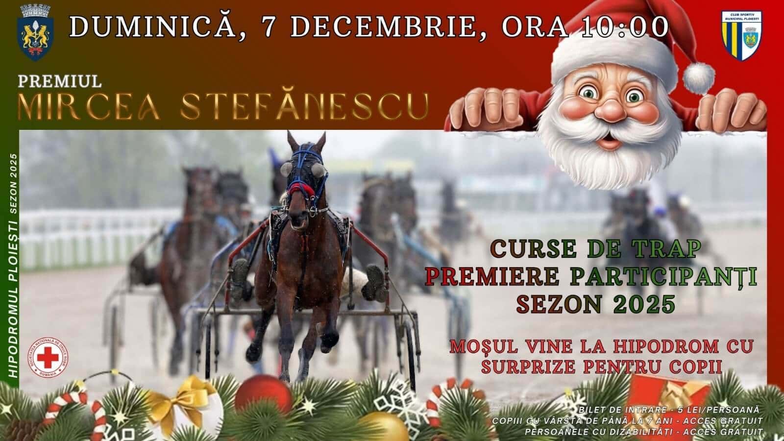 La ultima reuniune a acestui an, pentru cei mai mici, MOȘU ROȘU CRĂCIUN, în săniuța sa cea vestită plină cu daruri trasă de Rudolf, va poposi și la Hipodrom, într-o întâlnire devenită de-acum tradițională, atât pentru picimea ploieșteană cât și pentru mămici, tătici și bunici.