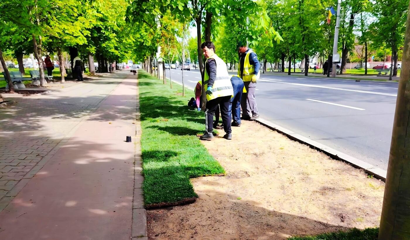 Lucrările de modernizare în spațiile verzi de pe Bulevardul Castanilor continuă. Echipele SGU montează rulouri de gazon. De săptămâna viitoare, astfel de intervenții vor avea loc și în alte parcuri din municipiu.