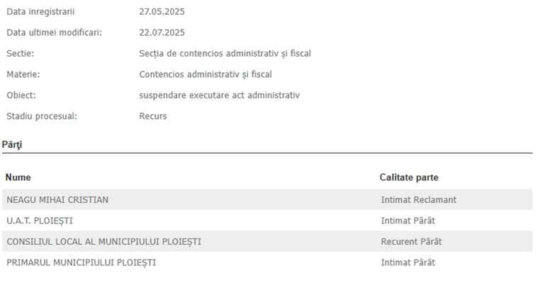 „Curtea de Apel Ploiești a respins recursul făcut de Consiliu Local al Municipiului Ploiești care dorea anularea suspendării HCL 51/25.02.2025 pe care reușisem să o obțin prin decizie a Tribunalului Prahova. Hotărârea este definitivă.