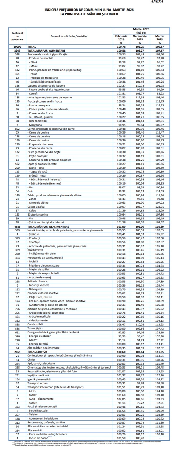 În raportul publicat miercuri, Institutul Național de Statistic arată că  indicele preţurilor de consum în luna martie 2026 comparativ cu luna februarie 2026 a fost 100,78%. Rata inflaţiei de la începutul anului (martie 2026 comparativ cu decembrie 2025) a fost 2,3% și cea anuală, comparativ cu luna martie 2025, a fost 9,9%.