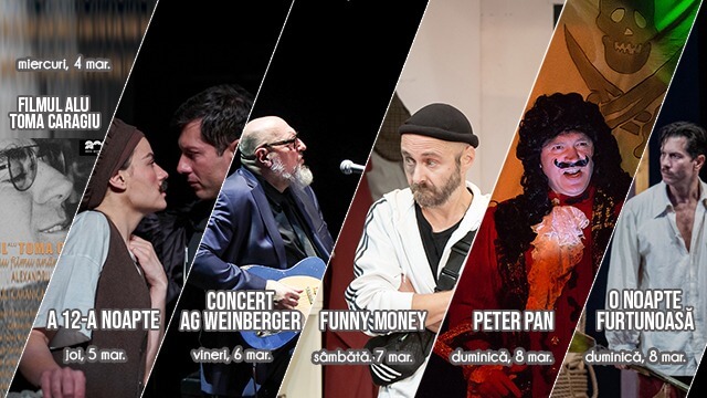 Emoția sărbătorii Marțișorului, a începutului de primavară și a Zilei Internaționale a Femeii, aduc, în această săptămână, pe scenele Teatrului „Toma Caragiu” o selecție diversă de spectacole: unul dintre cele mai cunoscute texte ale literaturii universale, reinterpretat într-o viziune scenică modernă, un concert inovator, care vă va purta în universul aparte al unui artist complex, supranumit „Mr. Blues” al României, o comedie plasată în societatea contemporană, ce demonstrează cum o întâmplare banală poate schimba viața unui cuplu, un spectacol ce evocă opera lui Caragiale, precum și o montare care îi va purta pe cei mici în fascinanta lume din Țara de Niciunde.