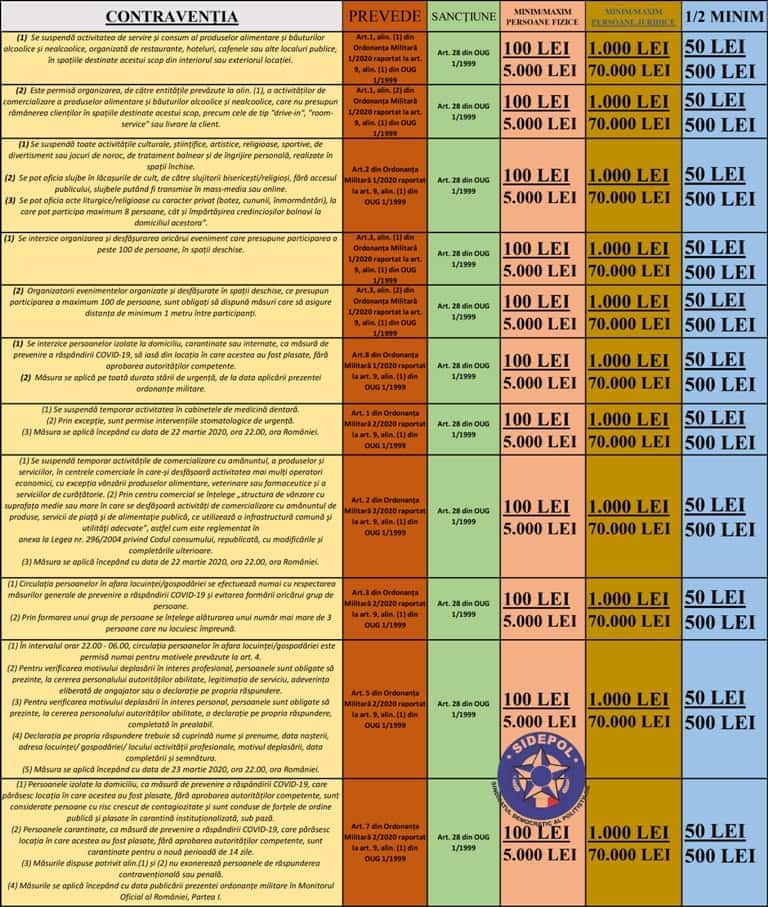Persoanele fiice riscă amenzi de până la 5.000 de lei pentru nerespectarea măsurilor prevăzute de ordonanța Militară 2/2020, în timp ce, pentru persoanele juridice, sancțiunile variază între 1.000 și 70.000 de lei.