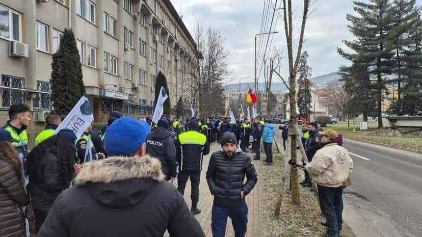 La rândul lor, reprezentanţii Sindicatului Naţional al Poliţiştilor şi al Personalului Contractual - SNPPC - din Ministerul Afacerilor Interne anunţă protest la IPJ Caraş-Severin, câteva zeci de persoane fiind pe trotuarul din faţa instituţiei.