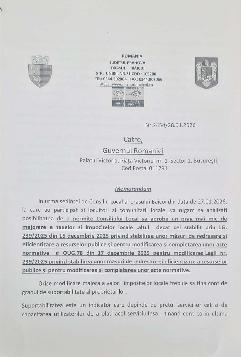 În documentul trimis la Guvern, primarul din Băicoi punctează că „orice modificare majoră a valorii impozitelor locale trebuie să ţină cont de gradul de suportabilitate al proprietarilor”.
