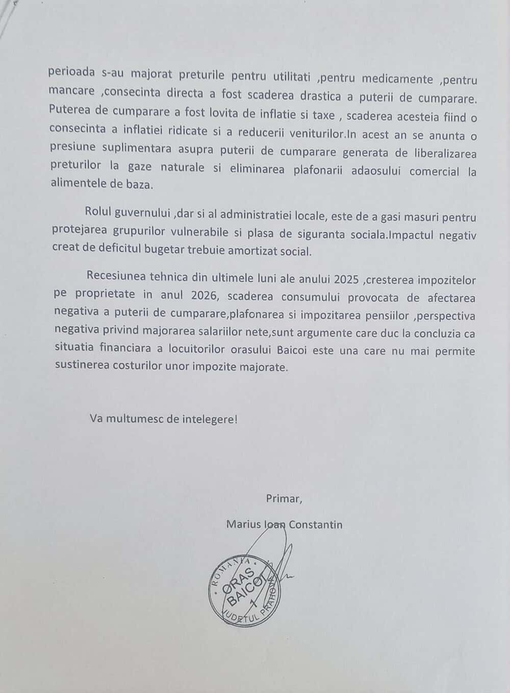 „Recesiunea tehnică din ultimele luni ale anului 2025, creşterea impozitelor pe proprietate în anul 2026, scăderea consumului provocată de afectarea negativă a puterii de cumpărare, plafonarea şi impozitarea pensiilor, perspectiva negativă privind majorarea salariilor nete, sunt argumente care duc la concluzia că situaţia financiară a locuitorilor oraşului Băicoi este una care nu mai permite susţinerea costurilor unor impozite majorate”, a concluzionat acesta.