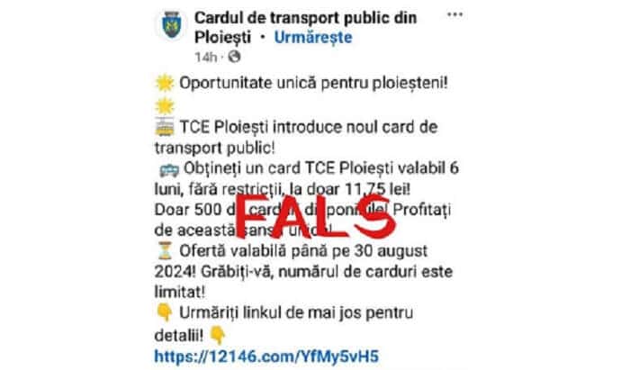 “Un cont fals de facebook, care nu reprezintă Societatea Transport Calatori Express SA , promovează vânzarea de carduri de călătorie tip abonament de 6 luni pentru suma de 11,75. Pentru a părea cât mai credibil anunțul, pe pagina respectivă există și comentarii false. Vă anunțăm pe această cale este vorba de o tentativă de fraudă în numele Transport Calatori Express SA și vă recomandăm să nu accesați link-ul postat în anunț. Pagina de facebook falsă se intitulează „Cardul de transport public din Ploiesti” și folosește, fără niciun drept, sigla Transport Calatori Express SA.”, scrie în comunicatul TCE.