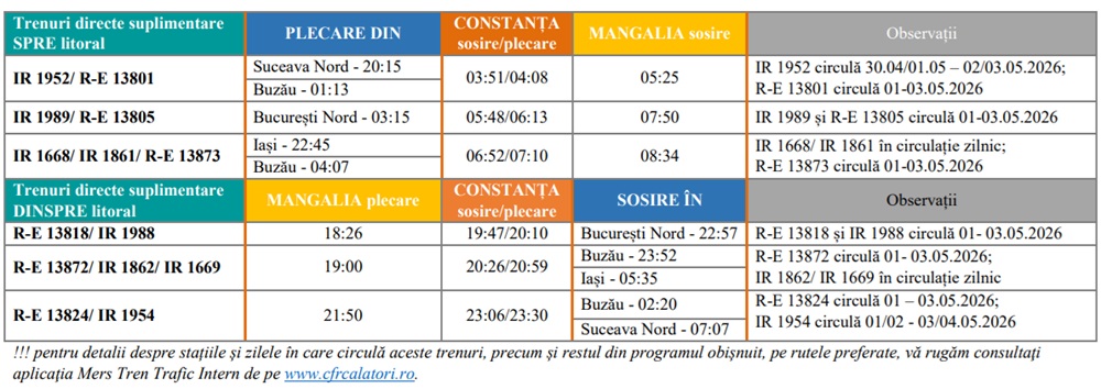 „În perioada 30 aprilie/ 1 mai –3/ 4 mai 2026, pe lângă trenurile directe din programul obișnuit de circulație, vor fi introduse trenuri directe suplimentare spre Constanța și stațiunile de pe litoral, inclusiv Mangalia, din București Nord și Suceava”, informează reprezentanții companiei.