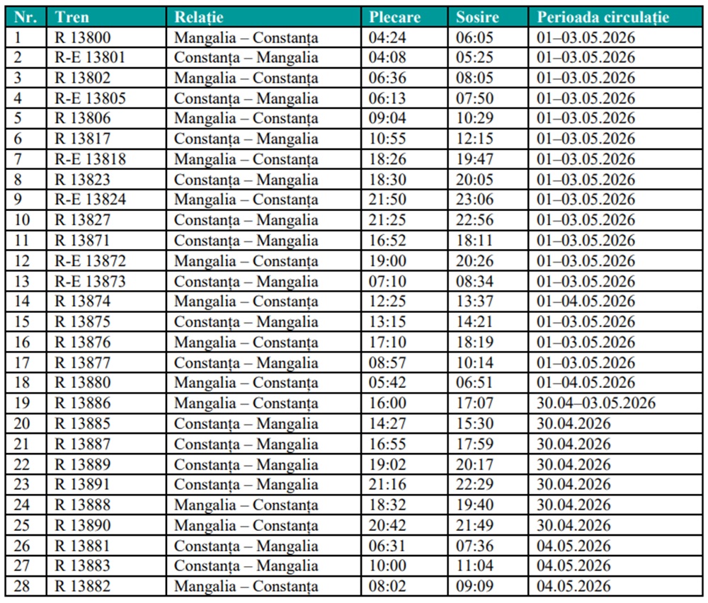 „De asemenea, în urma redeschiderii temporare a liniei Constanța – Mangalia de către managerul infrastructurii, CFR SA, în perioada 30 aprilie – 4 mai 2026, serviciul de transport Regio din programul de circulație al CFR Călători va fi operat temporar pe ruta Constanța – Mangalia și retur cu trenuri (vagoane și locomotive), în locul serviciilor auto utilizate în prezent pentru derularea lucrărilor efectuate de către CFR SA.