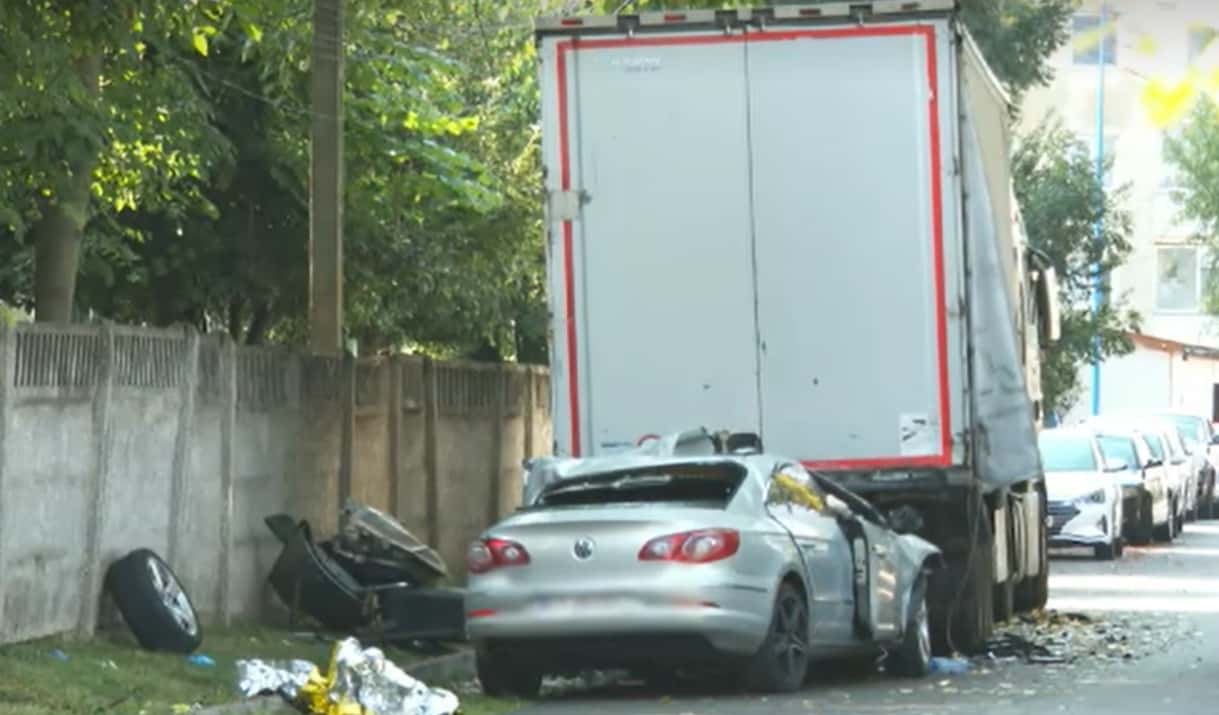 Mașina a rupt roțile TIR-ului și a intrat sub remorcă.