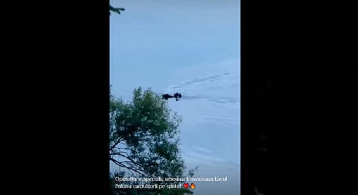 Filmările cu urşi continuă să fie prezente în mediul online. O ursoaică purtând în spate doi pui se pare că traversează înot Lacul Paltinu din judeţul Prahova.
