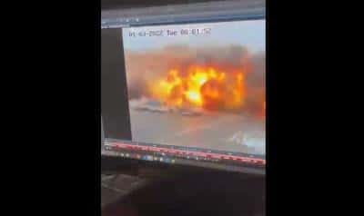 O rachetă a lovit în vecinătatea unei clădiri administrative din zona centrală. Proiectilul cade pe șosea, printre mașinile care se aflau în trafic.