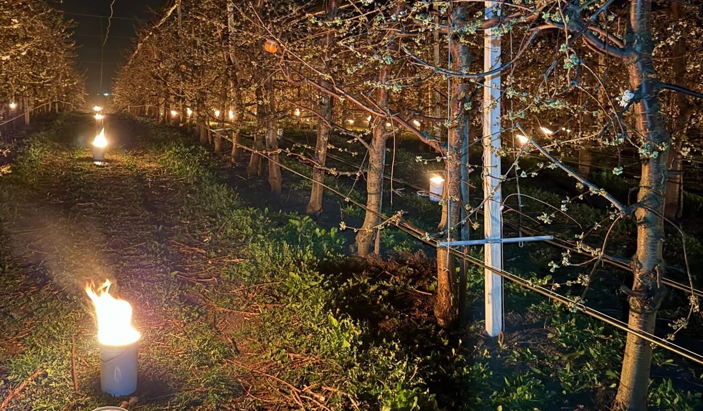 4.000 de lumânări antiîngheț aprinse printre rânduri. 40.000 de euro transformați în fum și căldură, ca să salvăm florile de cireș care, peste câteva săptămâni, vor deveni fructele pe care le veți găsi pe piață.