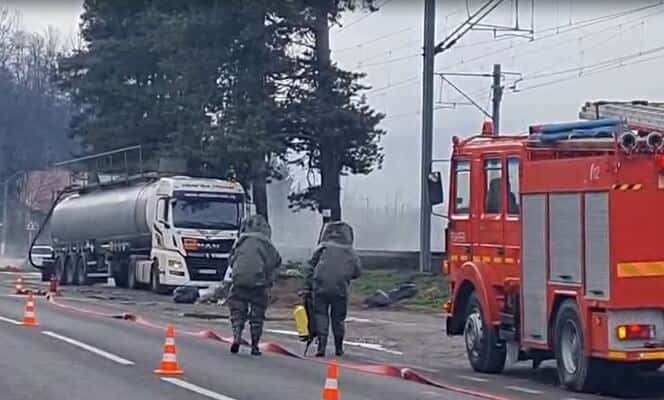 VIDEO 🎦 UPDATE. Scurgeri de acid sulfuric dintr-o cisternă, la Comarnic. Trafic blocat pe DN1. Populația din zonă este evacuată