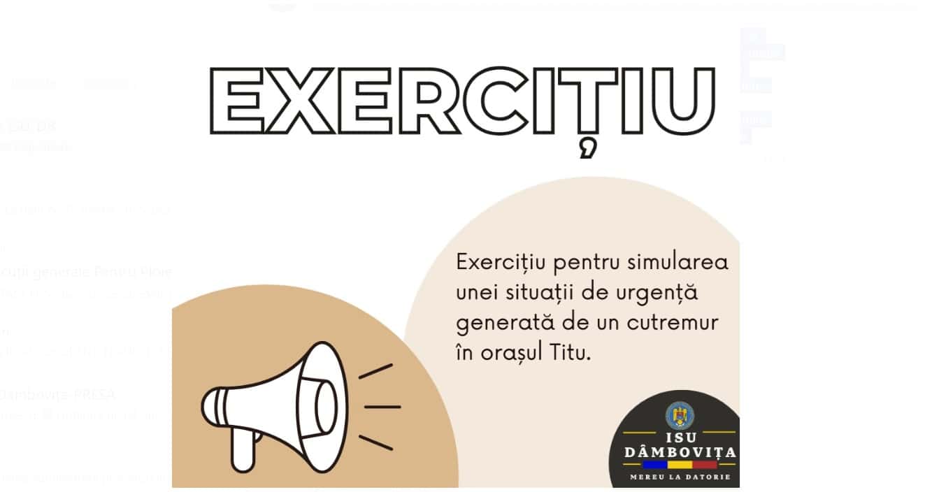 JOI 27 martie 2025, începând cu ora 10:00, Inspectoratul pentru Situații de Urgență „Basarab I” al județului Dâmbovița va organiza un exercițiu cu forțe și mijloace în teren în orașul Titu, ce va presupune simularea efectelor unui cutremur asupra unor blocuri de locuințe.