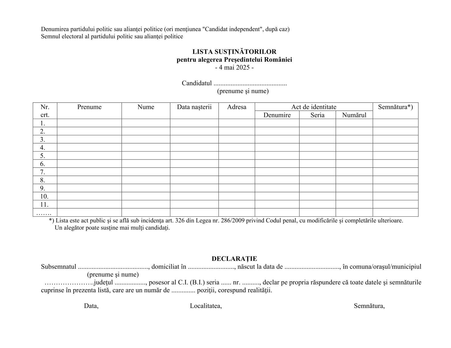 Modelul listei poate fi descărcat și de pe roaep.ro, secțiunea „Alegeri prezidențiale 2025/Candidați”.