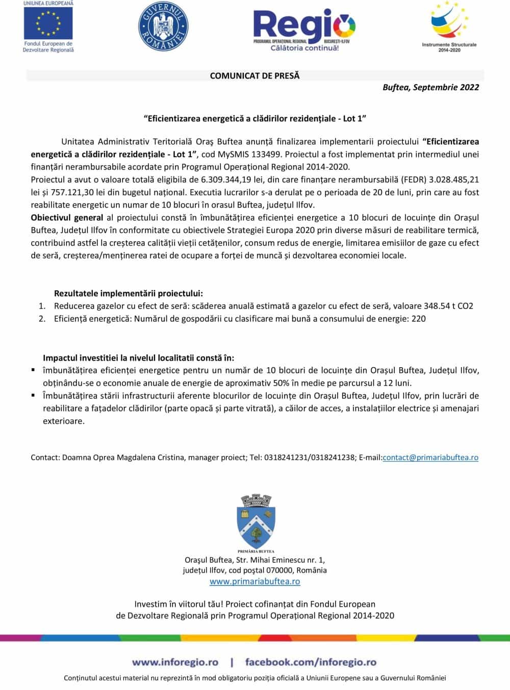 Unitatea Administrativ Teritorială Oraş Buftea anunță finalizarea implementarii proiectului “Eficientizarea energetică a clădirilor rezidențiale - Lot 1”, cod MySMIS 133499. Proiectul a fost implementat prin intermediul unei finanțări nerambursabile acordate prin Programul Operațional Regional 2014-2020.