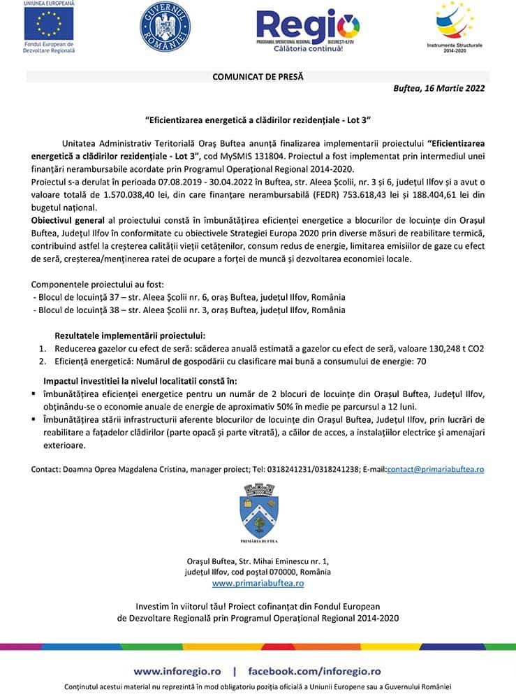 Unitatea Administrativ Teritorială Oraş Buftea anunță finalizarea implementarii proiectului “Eficientizarea energetică a clădirilor rezidențiale - Lot 3”, cod MySMIS 131804. Proiectul a fost implementat prin intermediul unei finanțări nerambursabile acordate prin Programul Operațional Regional 2014-2020.