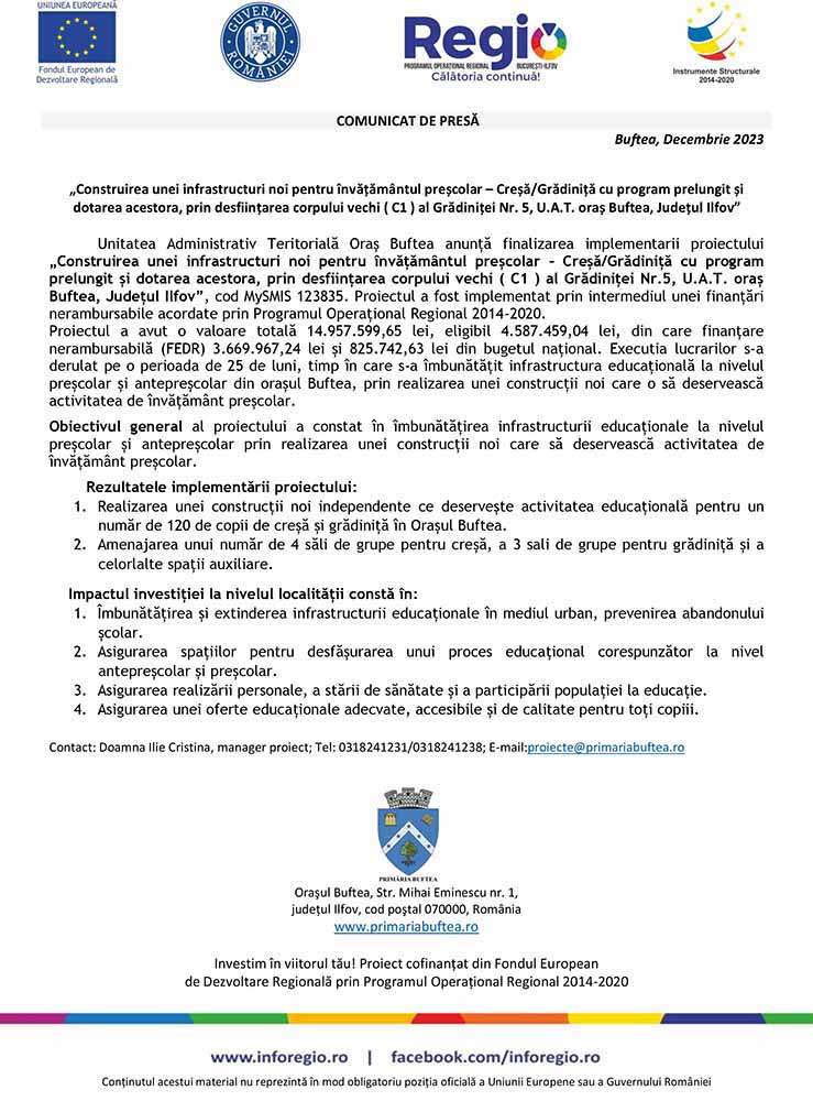 COMUNICAT DE PRESĂ - „Construirea unei infrastructuri noi pentru învățământul preșcolar – Creșă/Grădiniță cu program prelungit și dotarea acestora, prin desființarea corpului vechi ( C1 ) al Grădiniței Nr. 5, U.A.T. oraș Buftea, Județul Ilfov”