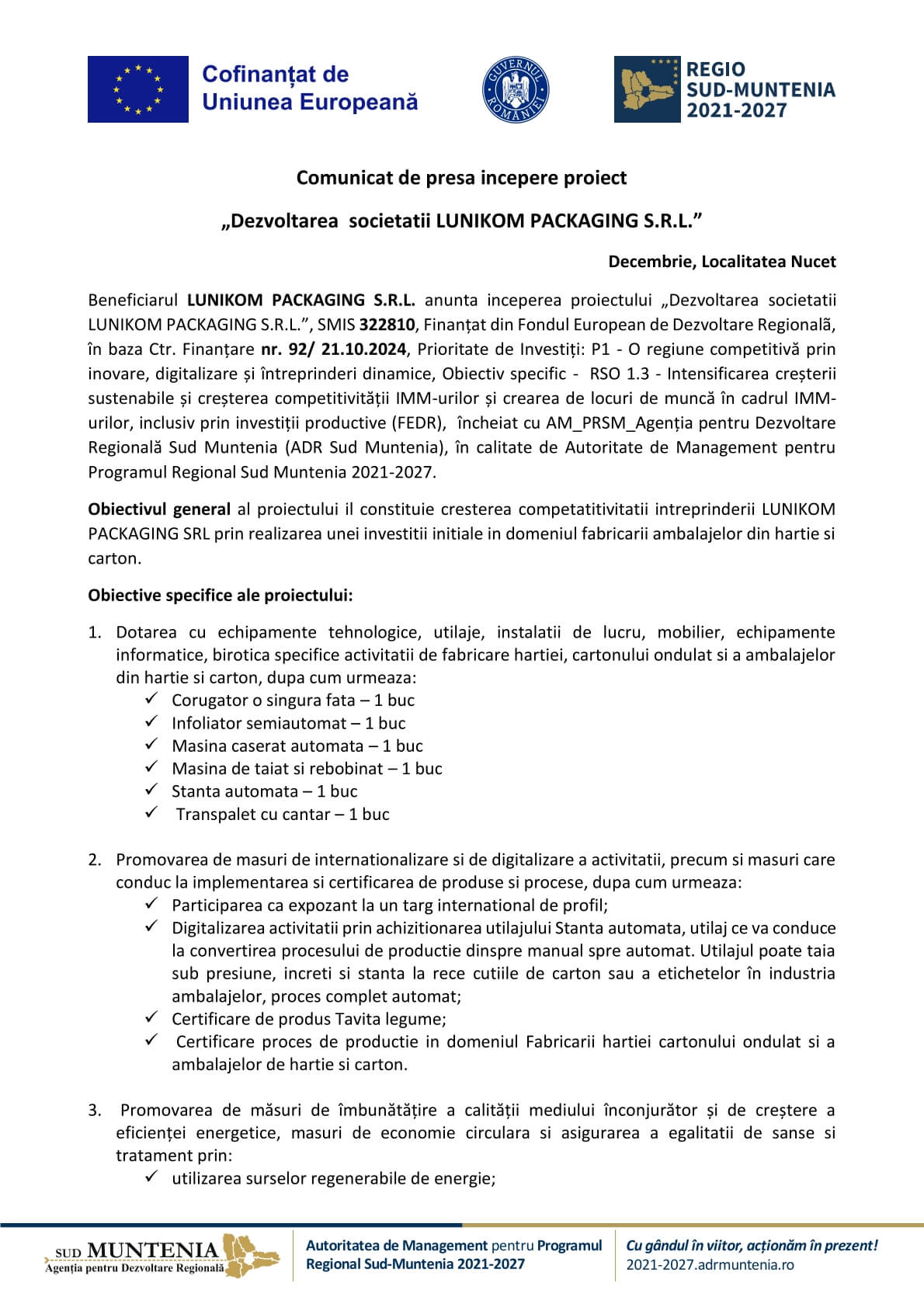 Beneficiarul LUNIKOM PACKAGING S.R.L. anunta inceperea proiectului „Dezvoltarea societatii LUNIKOM PACKAGING S.R.L.”, SMIS 322810, Finanțat din Fondul European de Dezvoltare Regionalã, în baza Ctr. Finanțare nr. 92/ 21.10.2024, Prioritate de Investiți: P1 - O regiune competitivă prin inovare, digitalizare și întreprinderi dinamice, Obiectiv specific - RSO 1.3 - Intensificarea creșterii sustenabile și creșterea competitivității IMM-urilor și crearea de locuri de muncă în cadrul IMM-urilor, inclusiv prin investiții productive (FEDR), încheiat cu AM_PRSM_Agenția pentru Dezvoltare Regională Sud Muntenia (ADR Sud Muntenia), în calitate de Autoritate de Management pentru Programul Regional Sud Muntenia 2021-2027.