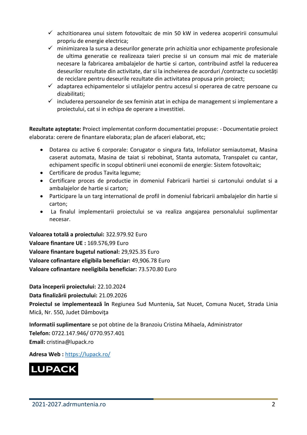 - Dotarea cu active 6 corporale: Corugator o singura fata, Infoliator semiautomat, Masina caserat automata, Masina de taiat si rebobinat, Stanta automata, Transpalet cu cantar, echipament specific in scopul obtinerii unei economii de energie: Sistem fotovoltaic;