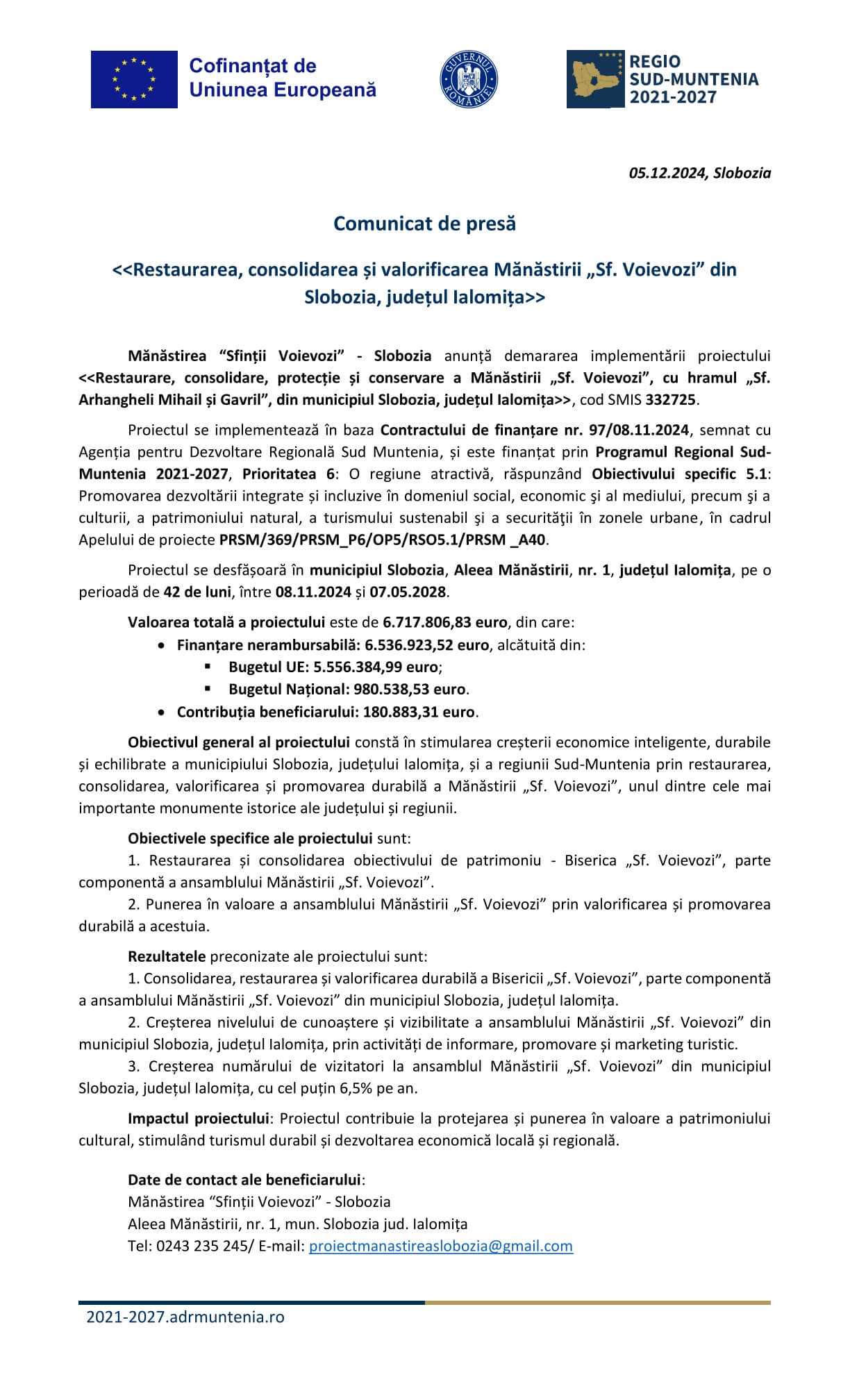 Mănăstirea “Sfinții Voievozi” - Slobozia anunță demararea implementării proiectului <<Restaurare, consolidare, protecție și conservare a Mănăstirii „Sf. Voievozi”, cu hramul „Sf. Arhangheli Mihail și Gavril”, din municipiul Slobozia, județul Ialomița>>, cod SMIS 332725.
