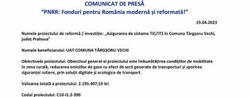 Comunicat de presă | „PNRR: Fonduri pentru România modernă și reformată!” | UAT COMUNA TÂRGȘORU VECHI