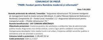 COMUNICAT DE PRESĂ | „PNRR: Fonduri pentru România modernă şi reformată” | UAT COMUNA BĂRCĂNEȘTI
