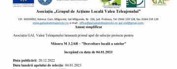 Anunț simplificat | Asociația GAL Valea Teleajenului lansează primul apel de selecție proiecte pentru Măsura M 3.2/6B – ”Dezvoltare locală a satelor”