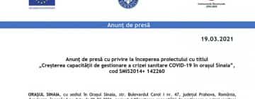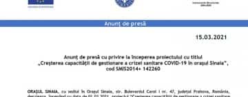 Anunţ de presă cu privire la începerea proiectului cu titlul „Creșterea capacității de gestionare a crizei sanitare COVID-19 în orașul Sinaia”, cod SMIS2014+ 142260