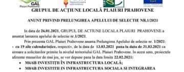 ANUNT PRIVIND PRELUNGIREA APELULUI DE SELECTIE NR.1/2021