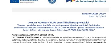 Comuna GORNET-CRICOV anunţă finalizarea proiectului