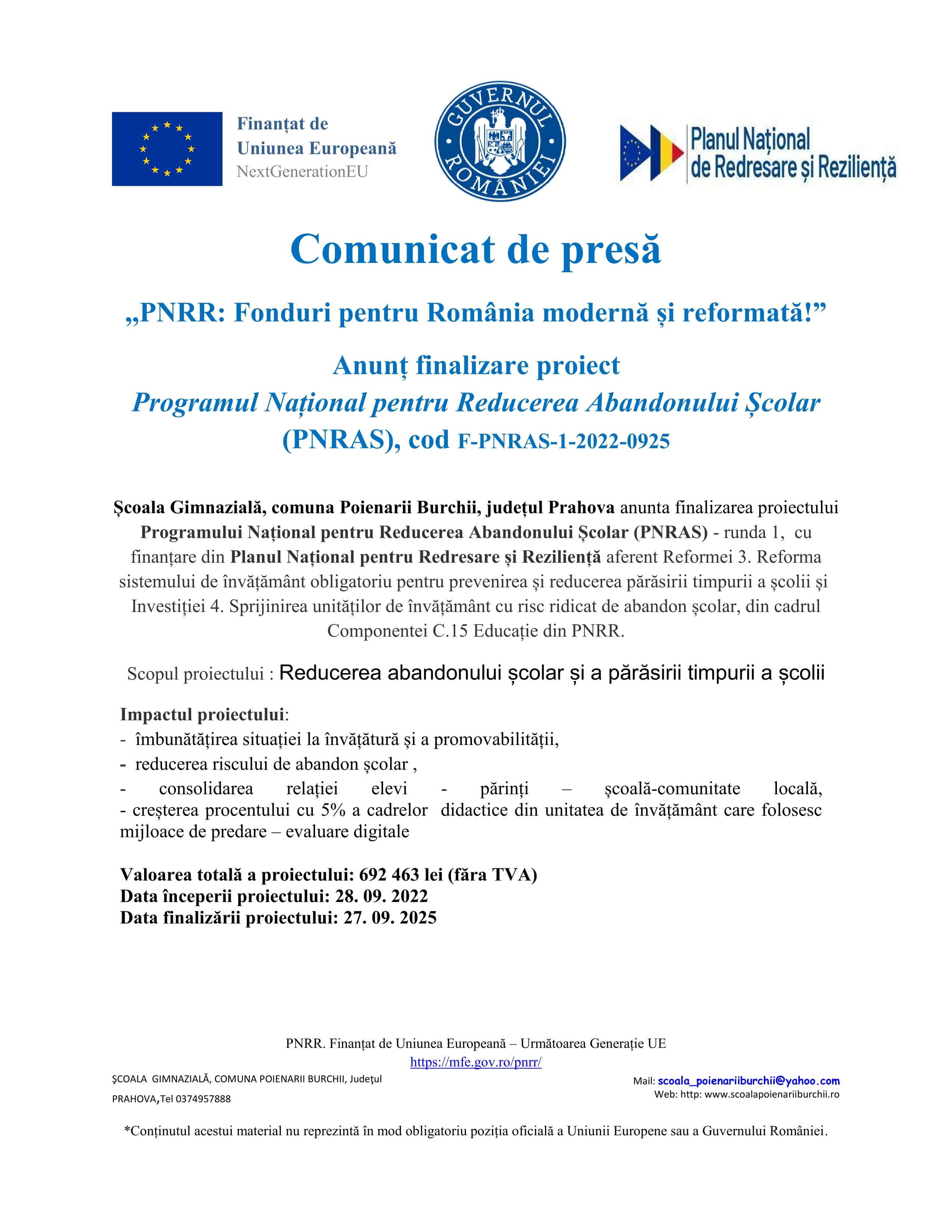 Școala Gimnazială, comuna Poienarii Burchii, județul Prahova - Anunț finalizare proiect Programul Național pentru Reducerea Abandonului Școlar (PNRAS)