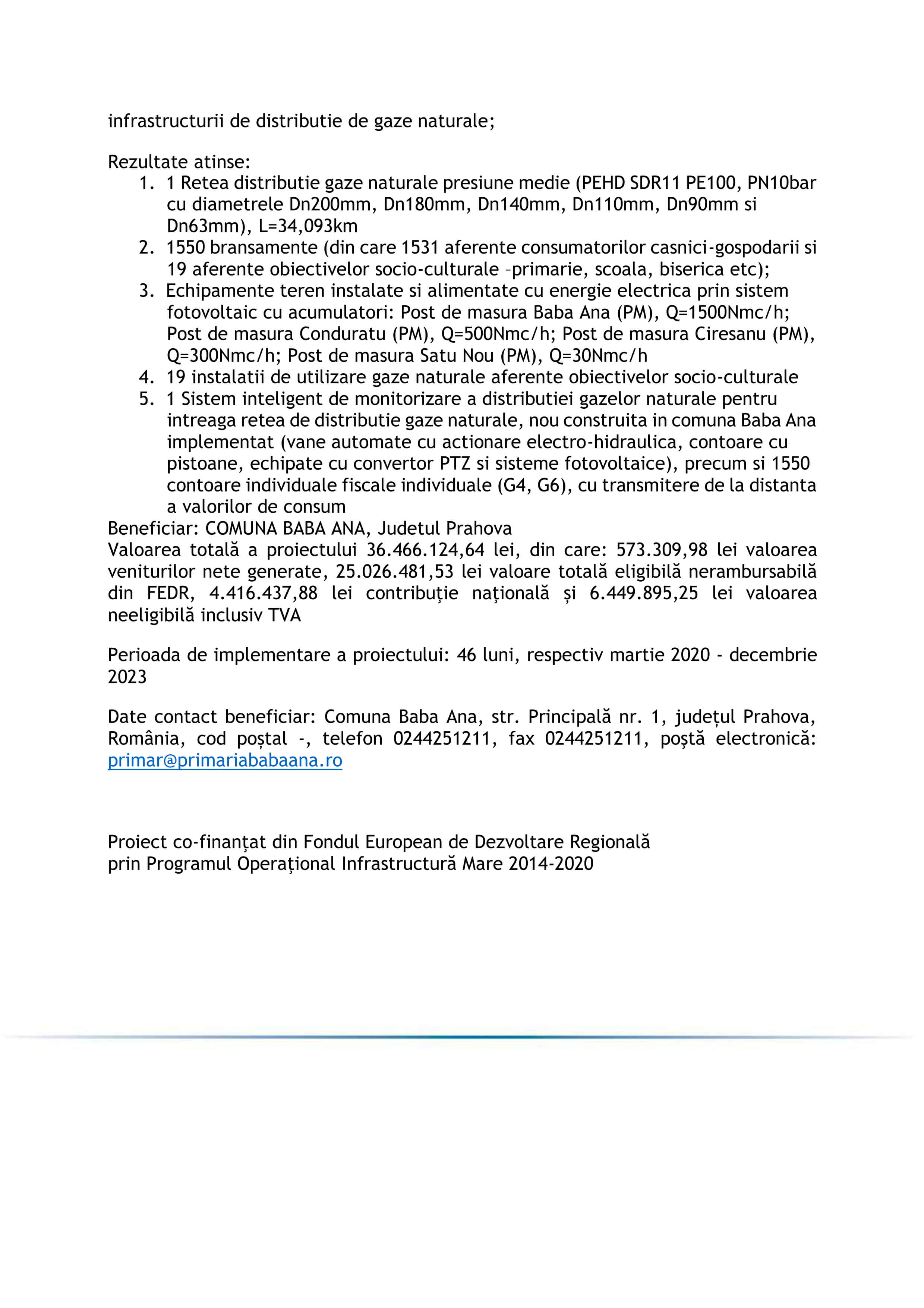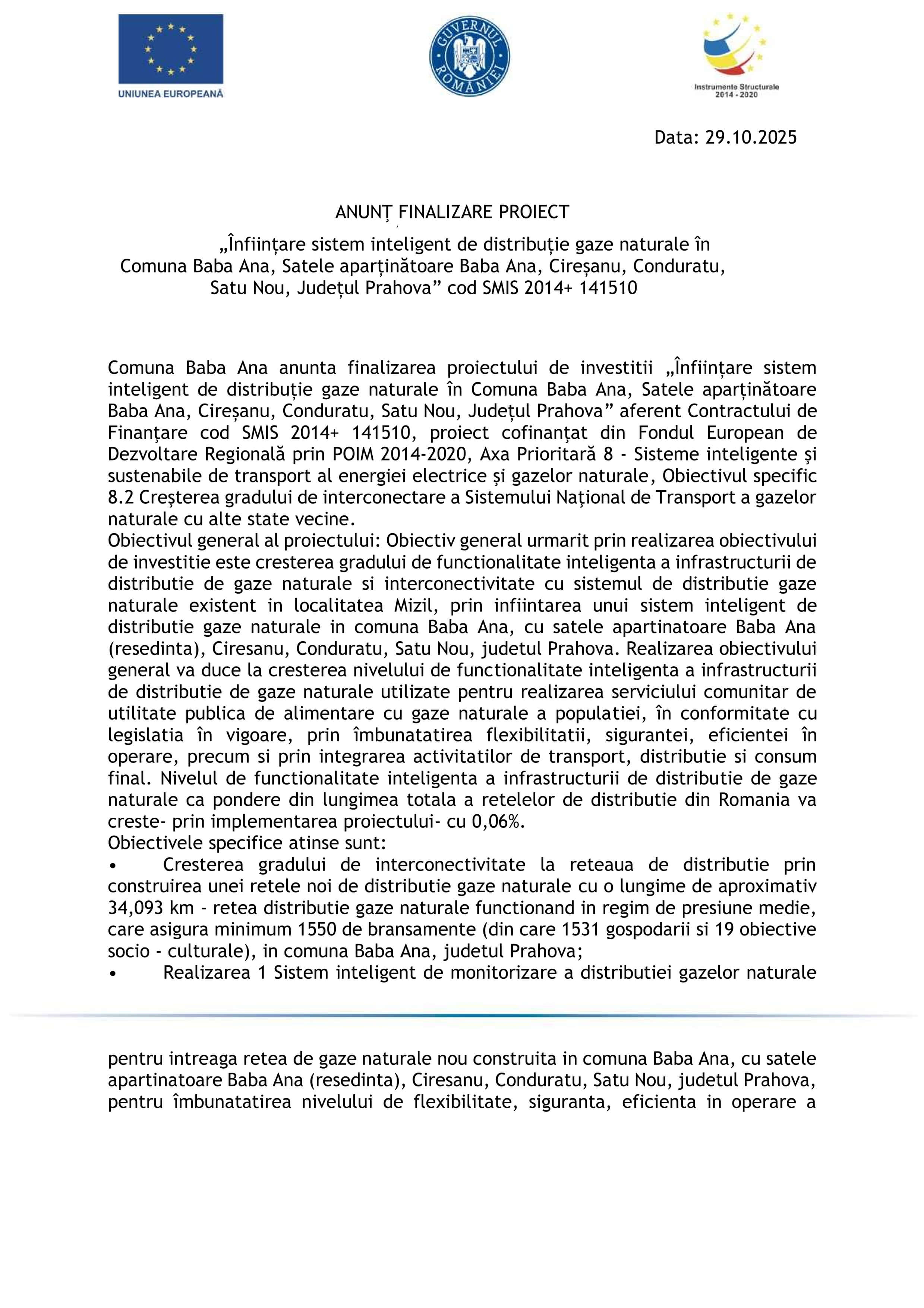 ANUNŢ FINALIZARE PROIECT „Înființare sistem inteligent de distribuție gaze naturale în Comuna Baba Ana, Satele aparținătoare Baba Ana, Cireșanu, Conduratu, Satu Nou, Județul Prahova” cod SMIS 2014+ 141510