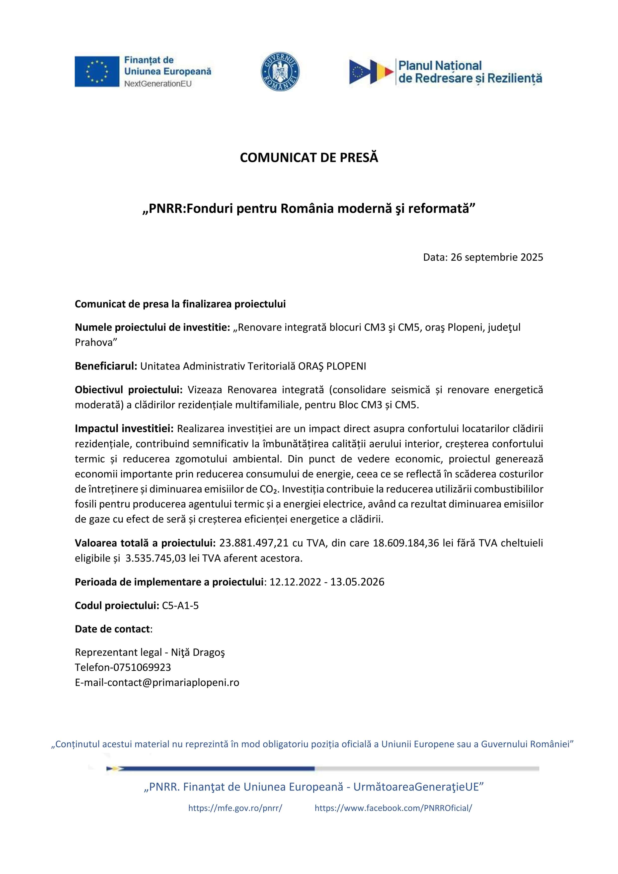 COMUNICAT DE PRESĂ - „PNRR:Fonduri pentru România modernă şi reformată” - „Renovare integrată blocuri CM3 şi CM5, oraş Plopeni, judeţul Prahova”