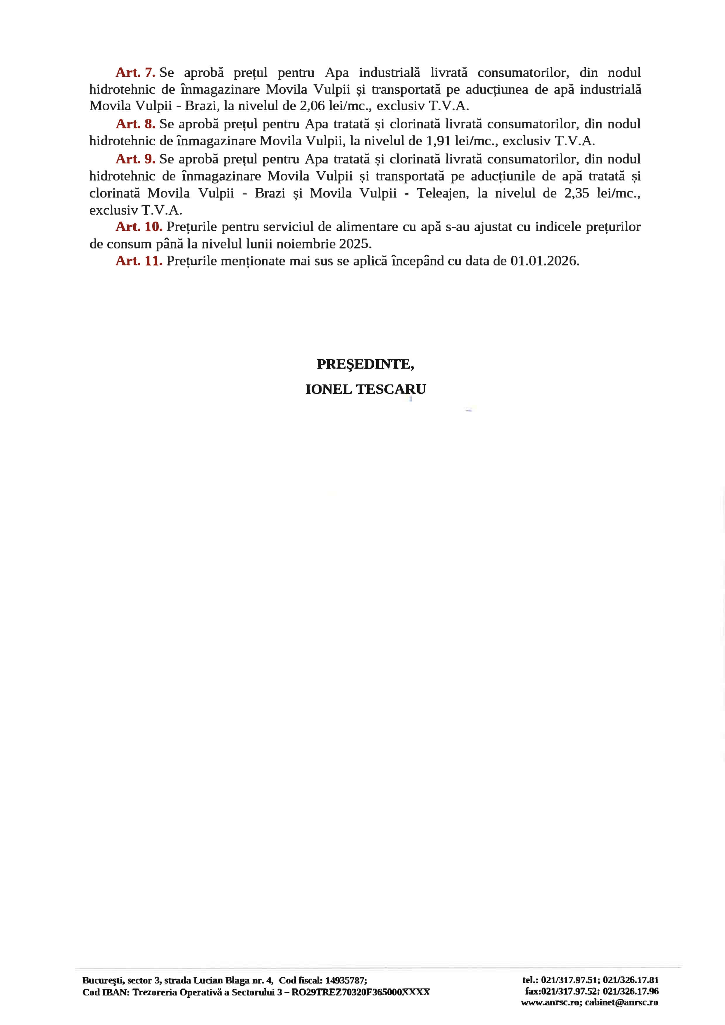 Prin Decizia ANRSC nr.154/02.12.2025, au fost aprobate tarifele de autoritatea națională competentă cu aplicare incepand cu data de 01.01.2026.