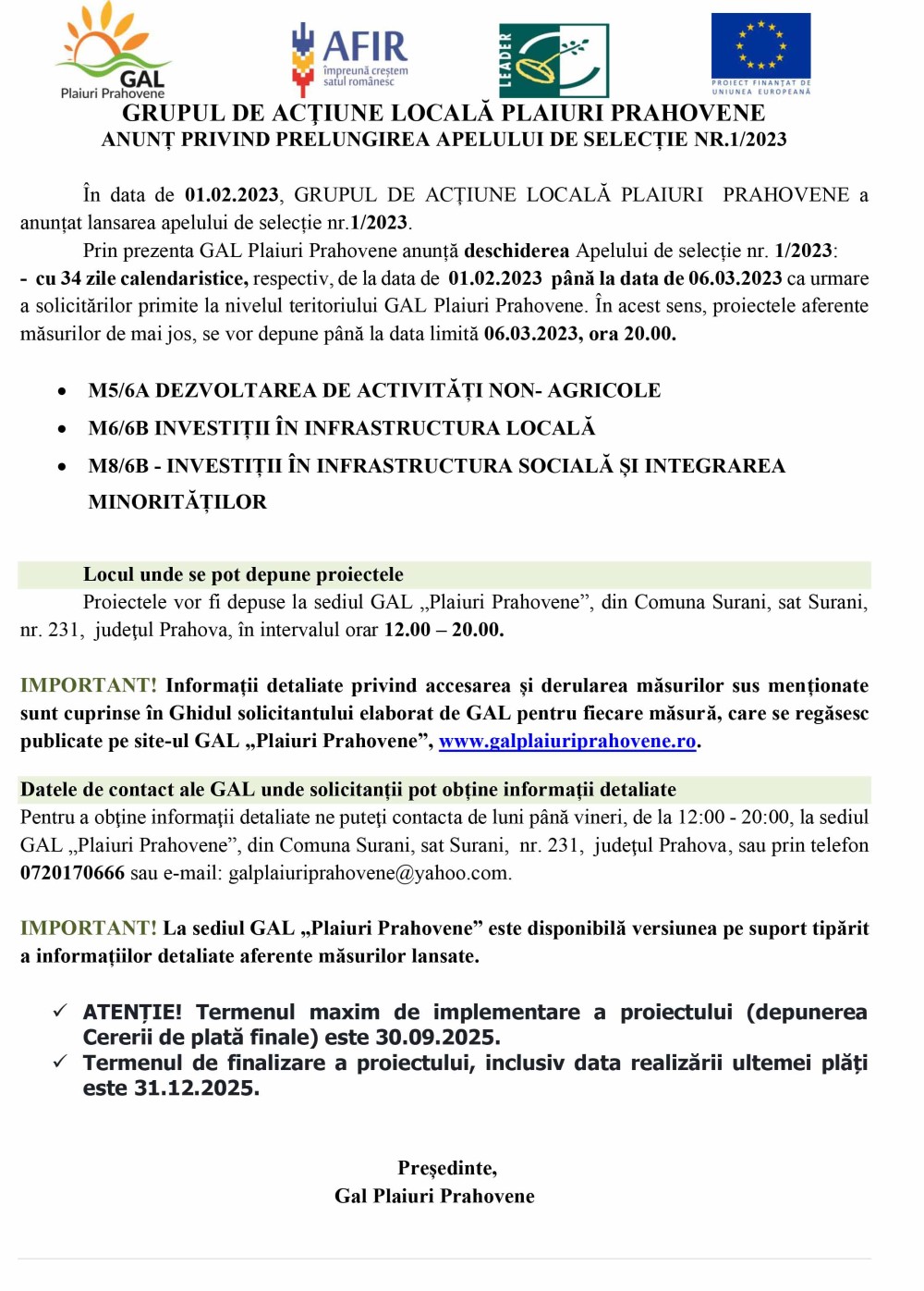 - cu 34 zile calendaristice, respectiv, de la data de 01.02.2023 până la data de 06.03.2023 ca urmare a solicitărilor primite la nivelul teritoriului GAL Plaiuri Prahovene. În acest sens, proiectele aferente măsurilor de mai jos, se vor depune până la data limită 06.03.2023, ora 20.00.
