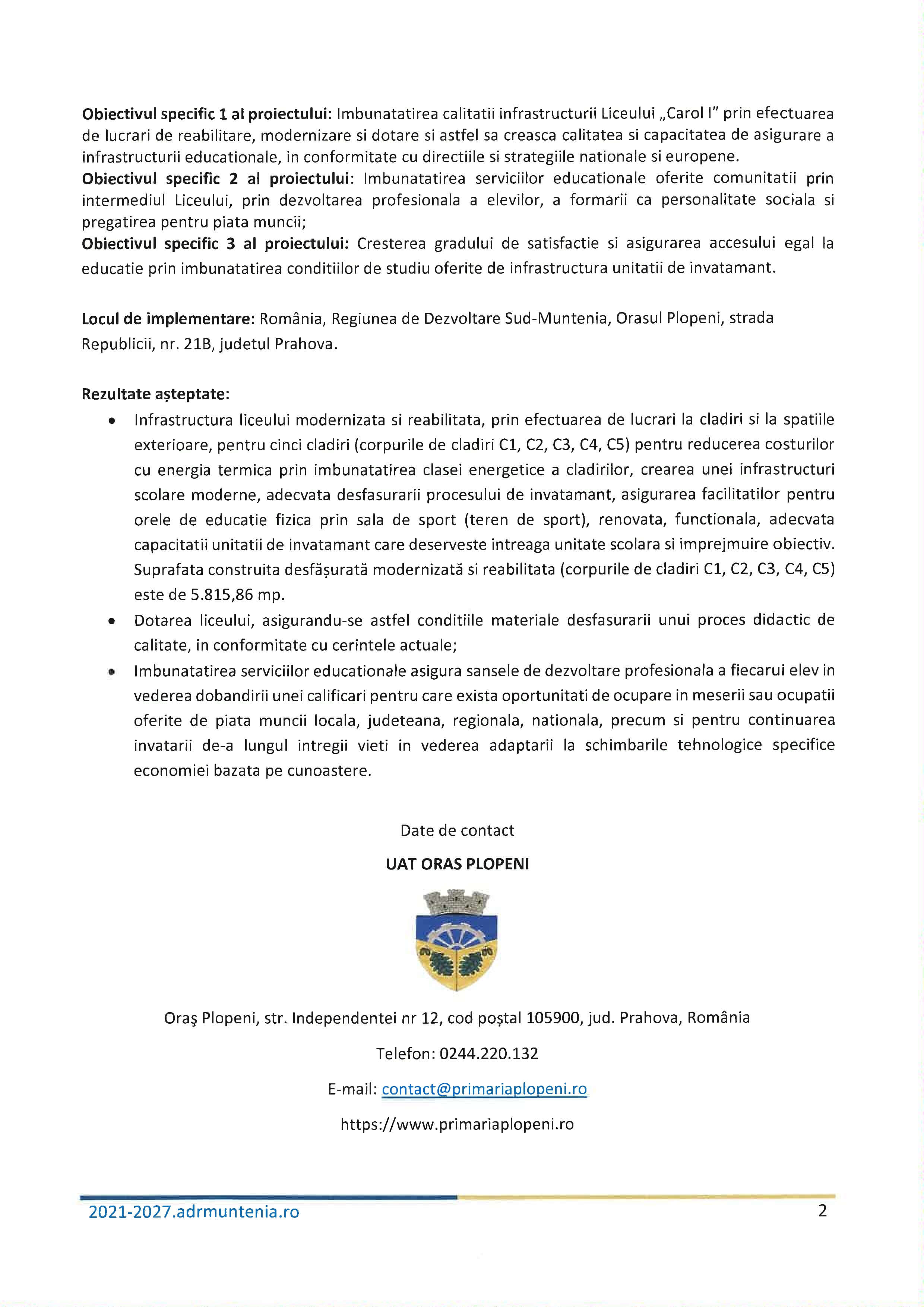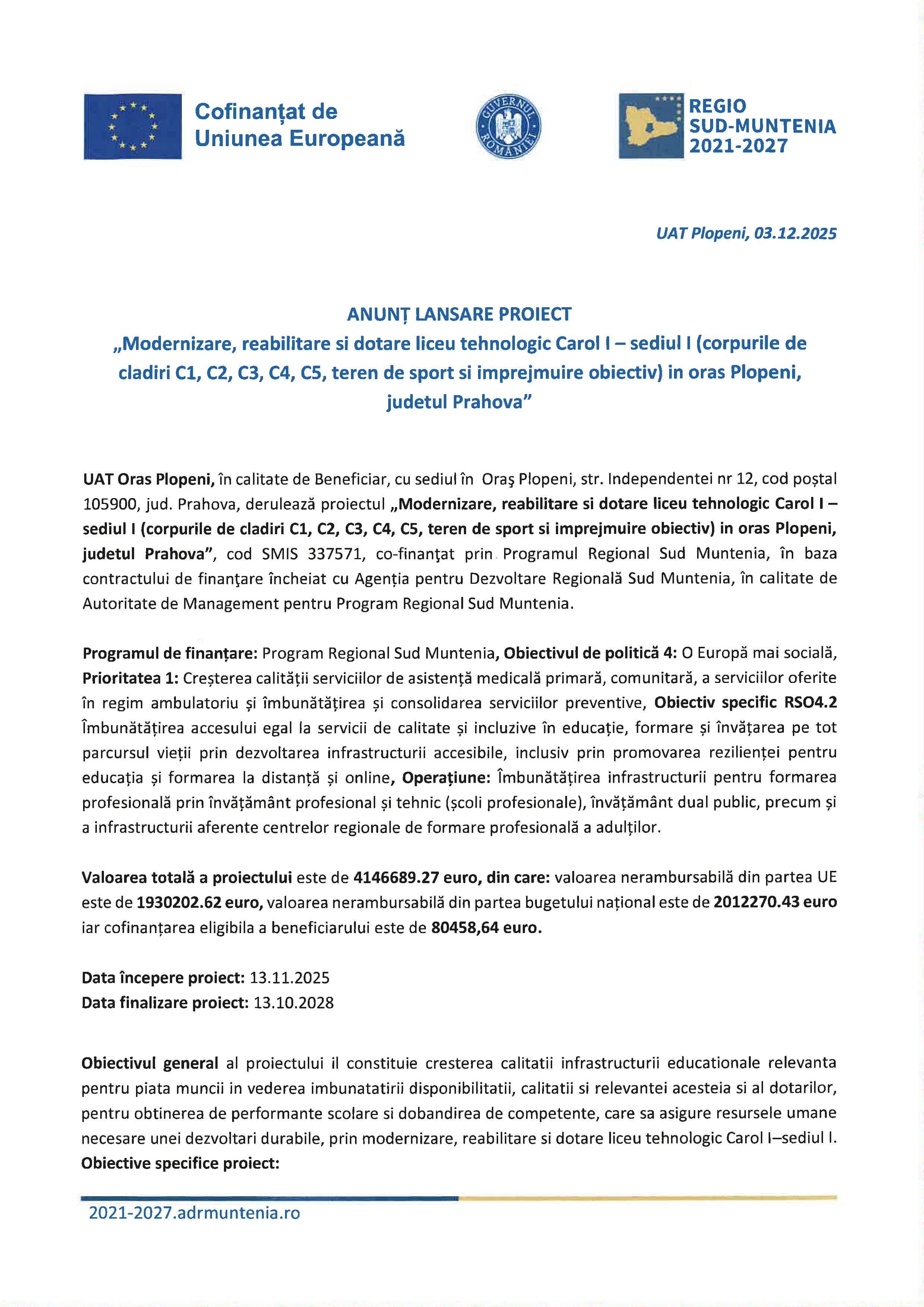 UAT Oras Plopeni, în calitate de Beneficiar, cu sediul în Oraș Plopeni, str. Independentei nr 12, cod poștal 105900, jud. Prahova, derulează proiectul „Modernizare, reabilitare si dotare liceu tehnologic Carol I — sediul I (corpurile de cladiri Cl, C2, C3, C4, C5, teren de sport si imprejmuire obiectiv) in oras Plopeni, judetul Prahova", cod SMIS 337571, co-finanțat prin Programul Regional Sud Muntenia, în baza contractului de finanțare încheiat cu Agenția pentru Dezvoltare Regională Sud Muntenia, în calitate de Autoritate de Management pentru Program Regional Sud Muntenia.