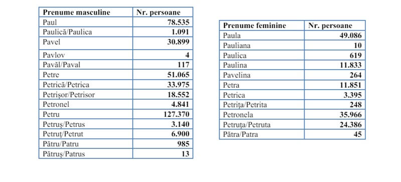 Anul acesta, pe 29 iulie, cu prilejul sărbători Sfinților Apostoli Petru și Pavel, își sărbătoresc onomastica 357.487 de români și 89.107 românce, potrivit cifrelor publicate de Direcţia Generală pentru Evidenţa Persoanelor din cadrul MAI.