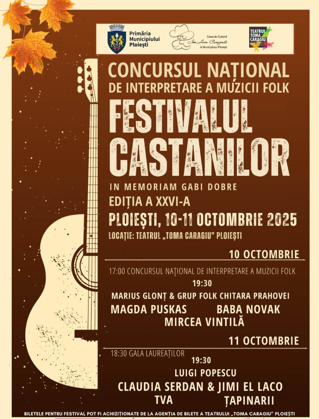 Casa de Cultură „Ion Luca Caragiale” a Municipiului Ploieşti și Primăria Municipiului Ploieşti, în parteneriat cu Teatrul „Toma Caragiu” Ploiești, organizează, în perioada 10-11 octombrie 2025, Festivalul Concurs Naţional de Interpretare a Muzicii Folk „Festivalul Castanilor - In memoriam Gabi Dobre”, ediţia XXVI.