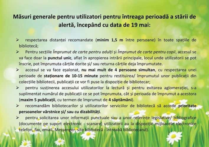"Acțiunile întreprinse de Biblioteca Județeană țin cont de necesitatea respectării măsurilor de igienă și prevenție în ceea ce privește COVID-19, de contextul epidemiologic actual și au ca scop eficientizarea aplicării măsurilor de prevenție a utilizatorilor serviciilor de bibliotecă și evitarea unei posibile contaminări a persoanelor, acestea permițând în același timp și asigurarea unui cadru funcțional sigur, ce garantează sănătatea cetățenilor, dar și securitatea și sănătatea în muncă a angajaților bibliotecii", au mai comunicat reprezentanții instituției.