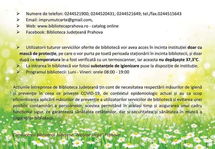 Conducerea Bibliotecii Județene "Nicolae Iorga" a anunțat că de marți, 19 mai, va fi reluată activitatea cu publicul, în secțiile Împrumut pentru adulți și Împrumut pentru copii, dar cu respectarea anumitor condiții impuse în actualul context epidemiologic.
