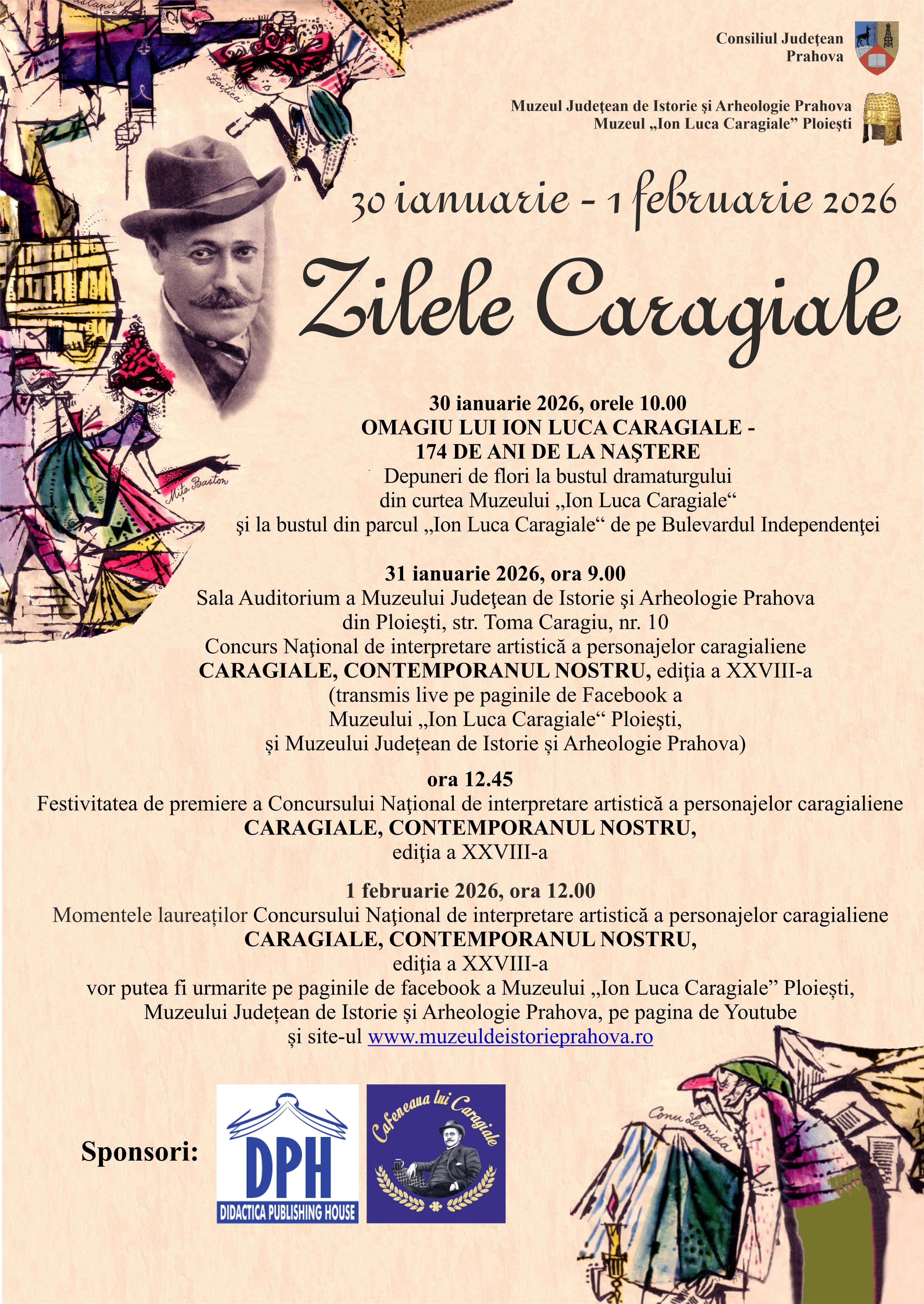 Duminică, 1 februarie 2026, pe site-ul muzeuldeistorieprahova.ro, pe paginile de Facebook ale Muzeului Judeţean de Istorie şi Arheologie Prahova şi Muzeului „Ion Luca Caragiale”, cât şi pe Youtube, veți putea urmări laureații celei de-a XXVIII-a ediții a Concursului Național de interpretare artistică a personajelor caragialiene „Caragiale, contemporanul nostru”.