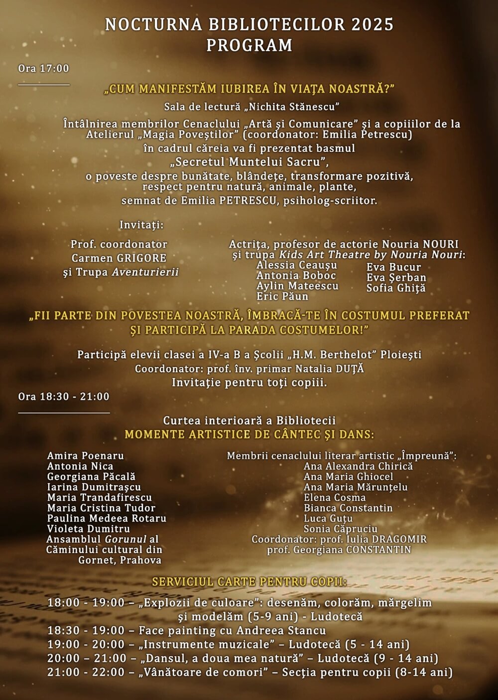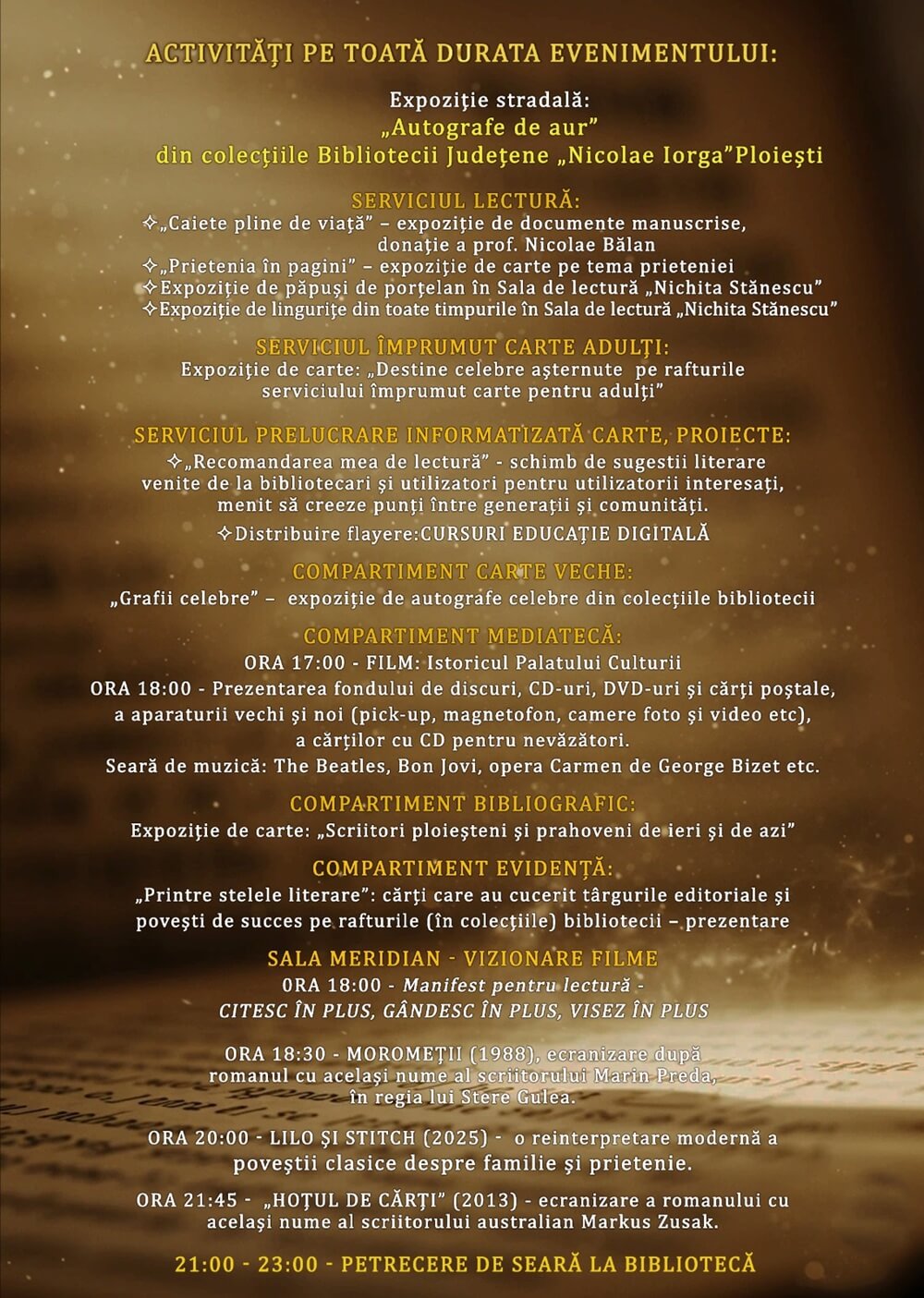 „Evenimentul susține și promovează patrimoniul local, național, cultura, educația, și este organizat la nivel naţional de Asociaţia Naţională a Bibliotecarilor şi Bibliotecilor Publice din România (ANBPR), cu participarea bibliotecilor publice din România și Republica Moldova”, au transmis reprezentanții Bibliotecii Județene „Nicolae Iorga”.